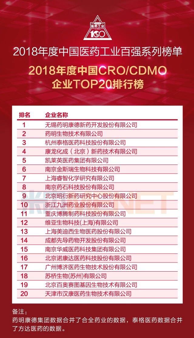 在2018年度中國CRO(含CDMO)企業(yè)TOP20排行榜中,藥明康德、藥明生物、泰格醫(yī)藥位列前三甲。