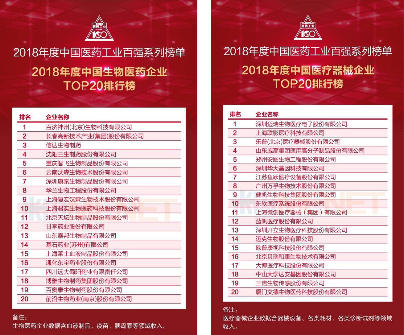 在2018年度中國生物醫(yī)藥(含血液制品、疫苗、胰島素等)企業(yè)TOP20排行榜中,百濟神州、長春高新、信達生物位列前三甲。