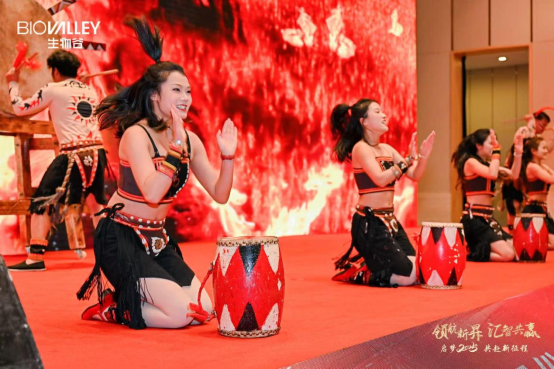 年會之上,舞臺流光溢彩、節目精彩紛呈。開場以云南特色太陽鼓舞拉開恢弘序幕。舞者身姿矯健,用力量之美點燃現場。一聲聲鼓樂振奮人心,一句句吶喊響徹會場,預示著生物谷藥業未來征程廣闊浩瀚。